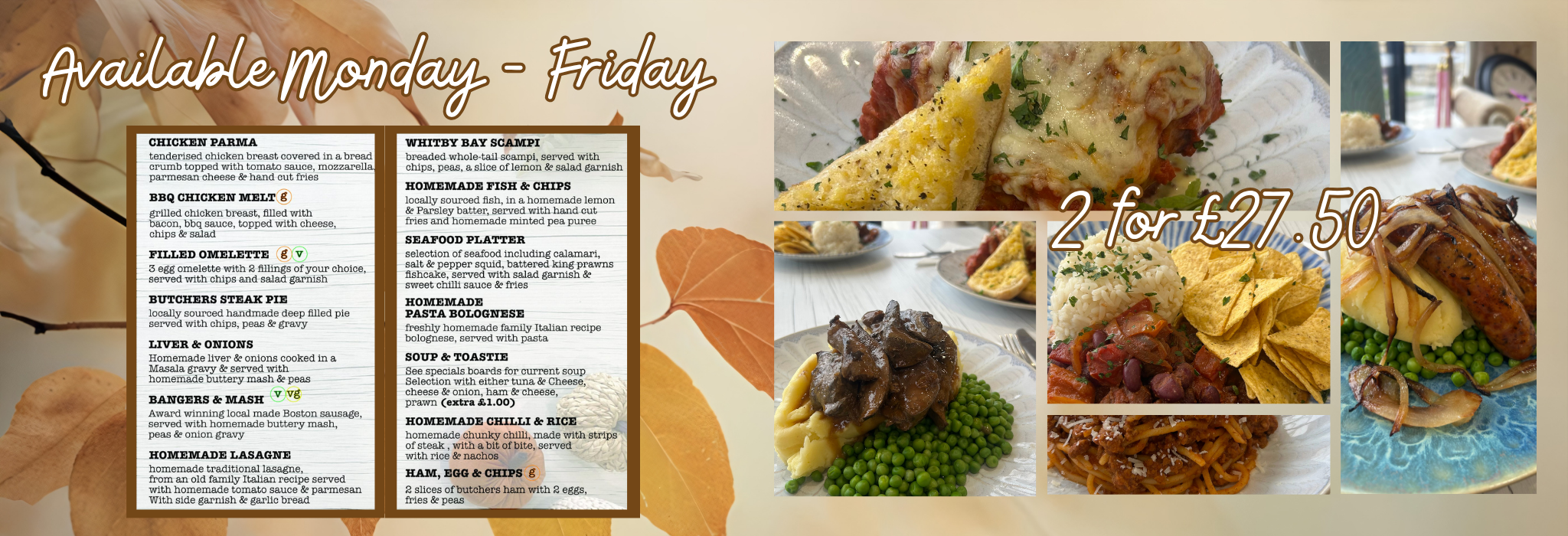Our main meals are once again on special throughout the Autumn/winter months. Every Monday to Friday you can choose 2 mains for £27.50. Perfect for a lovely lunch while it’s cold outside. These meals are available on the weekends priced at £16.96 each.