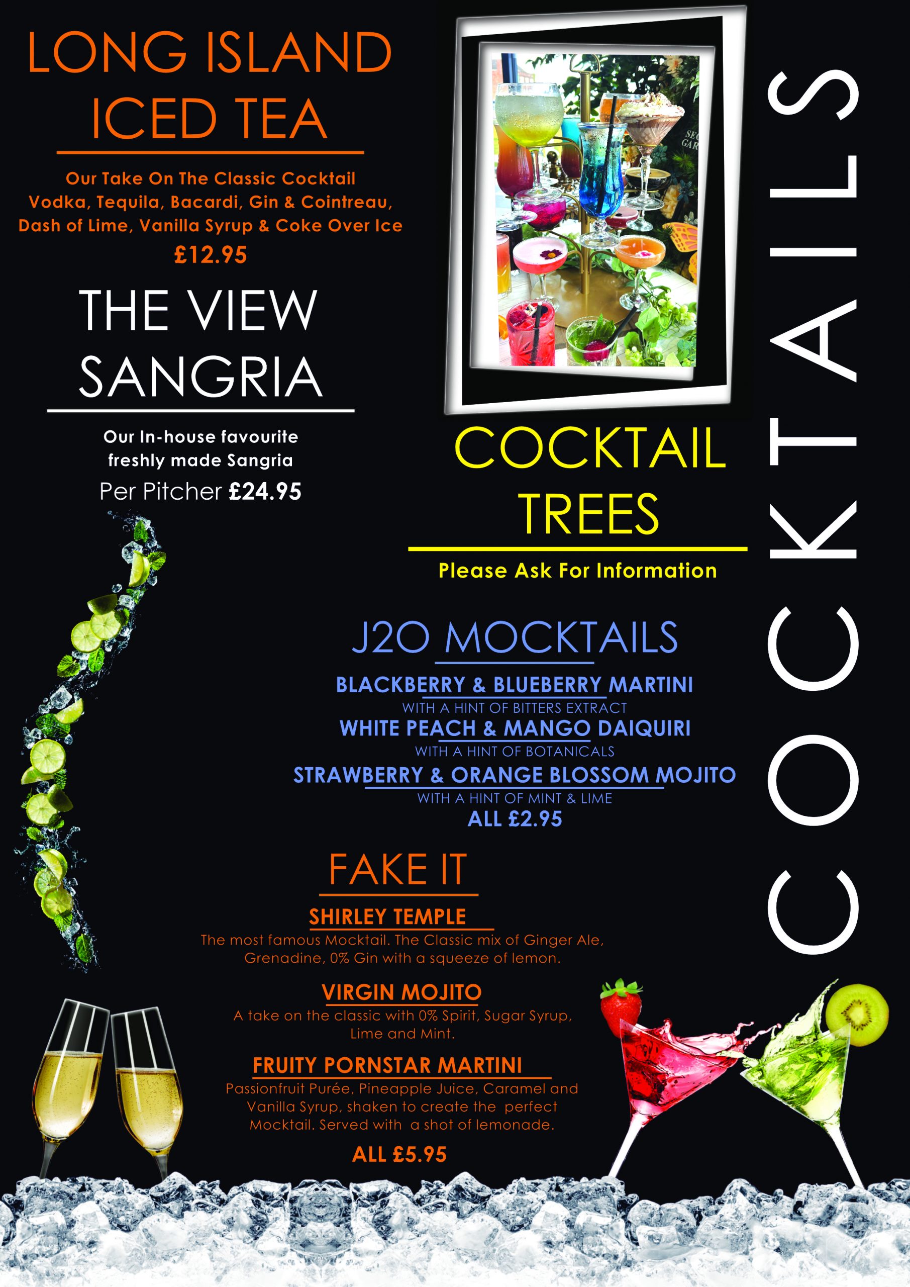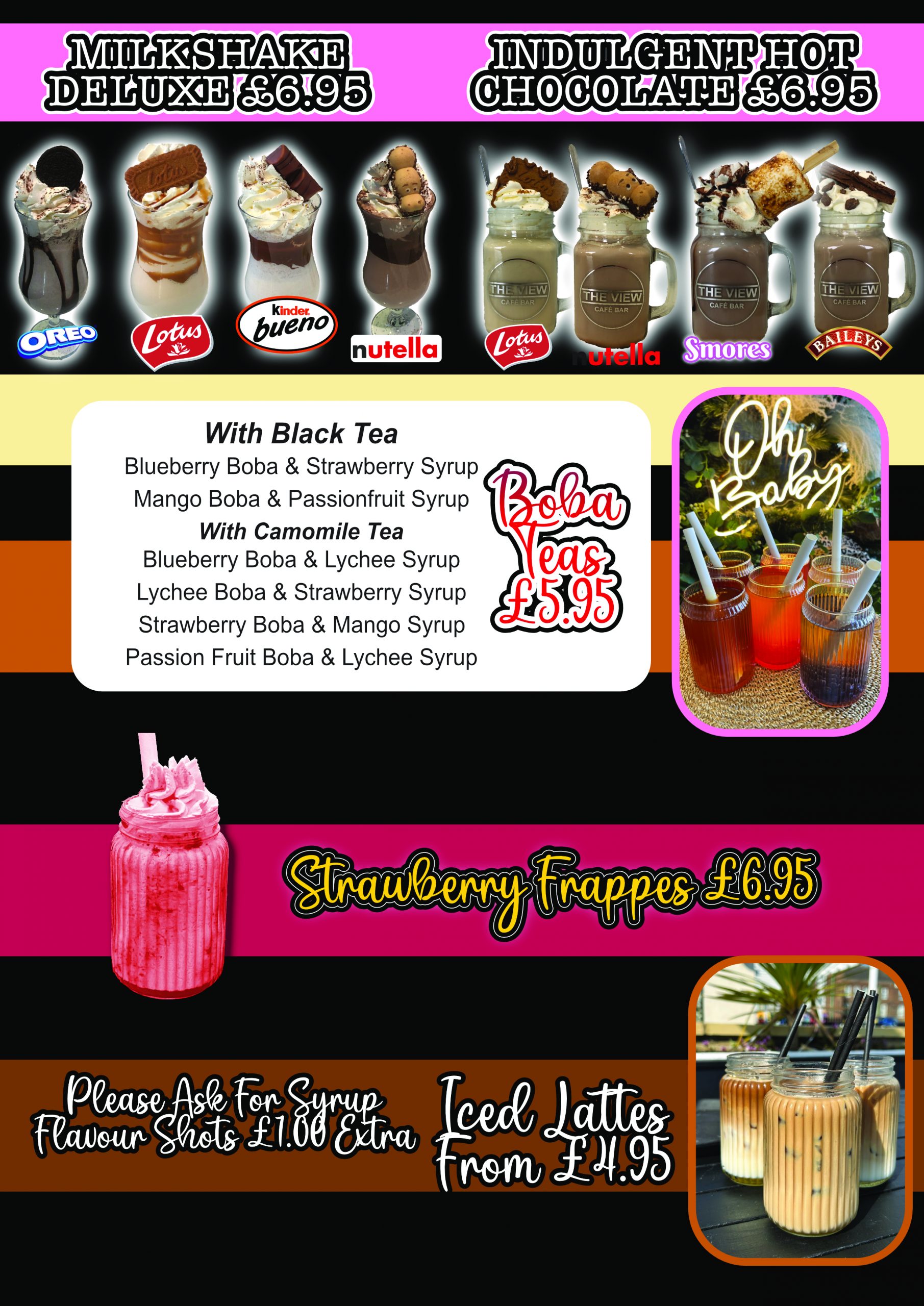 Here at The View we have a wide range of drinks from hot drinks to a fully stocked bar. We also have a an amazing selection of custom milkshakes and hot chocolates. And don’t forget our cocktails!