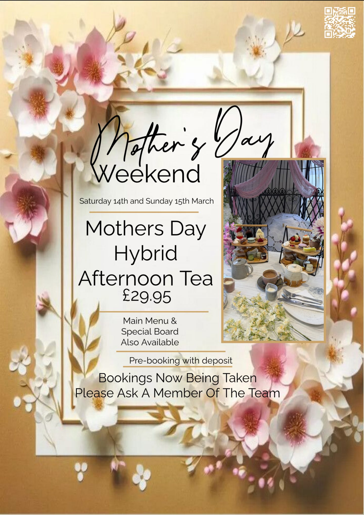 We also have the Mother’s Day afternoon tea available to book. PLEASE NOTE THAT THIS WILL BE THE ONLY AFTERNOON TEA AVAILABLE TO BOOK OVER THE WEEKEND. This includes a selection of finger sandwiches, mini fish and chips, a scone served with jam, clotted cream and butter, unlimited tea or coffee and a selection of sweet treats and cakes. This is priced at £29.95 per person. It also needs to be pre booked and a deposit paid. This deposit is non refundable. We very much recommend that you book a table if you wish to join us over the weekend even if you plan on ordering from the menu. This is a very busy weekend and in previous years we have had no indoor seating available for walk ins.