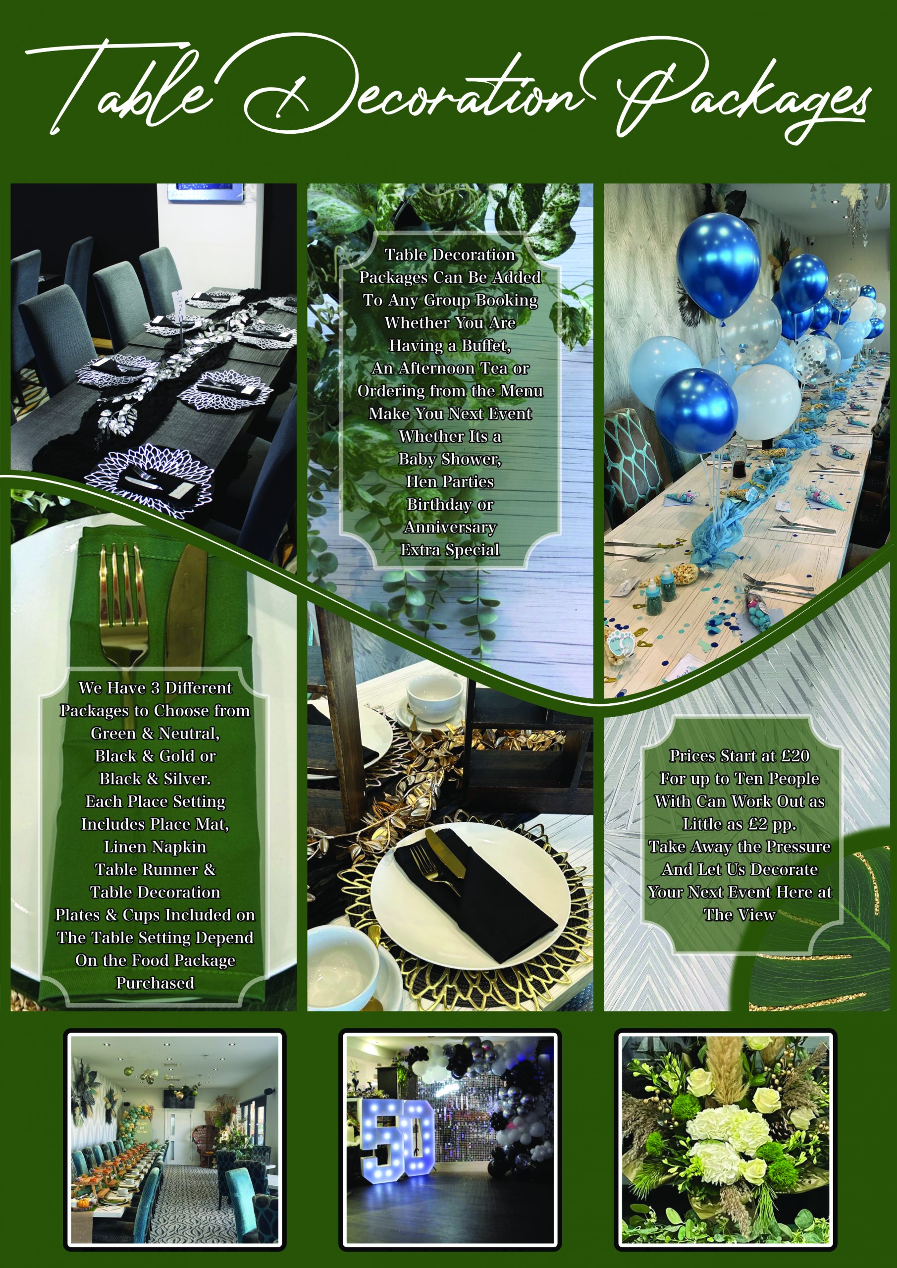 We are able to offer a wide range of foods and drinks. We can offer decoration packages or you can bring decorations of your own. Below are a selection of occasions held at The View with varying packages, some decorated by us and some decorated by the customer.